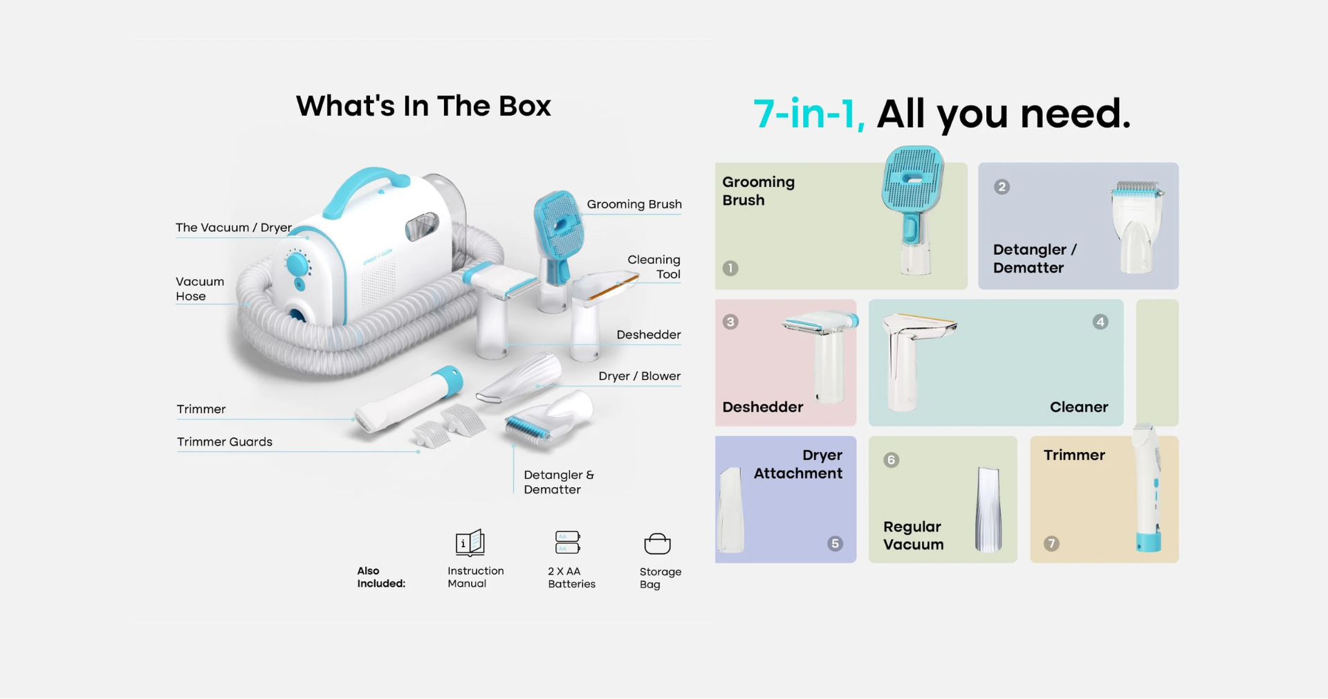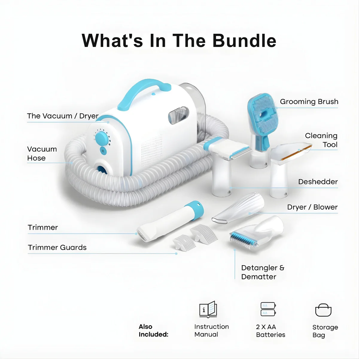Each Uproot Pet Grooming Kit comes with: 1x Kit 1x Hose 1x Grooming Brush 1x Detangler 1x Deshedder 1x Cleaner 1x Trimmer 4x Trimmer Guards 1x Blower 2x AA Batteries for the Trimmer 1x Bag to hold accessories 1x User Manual