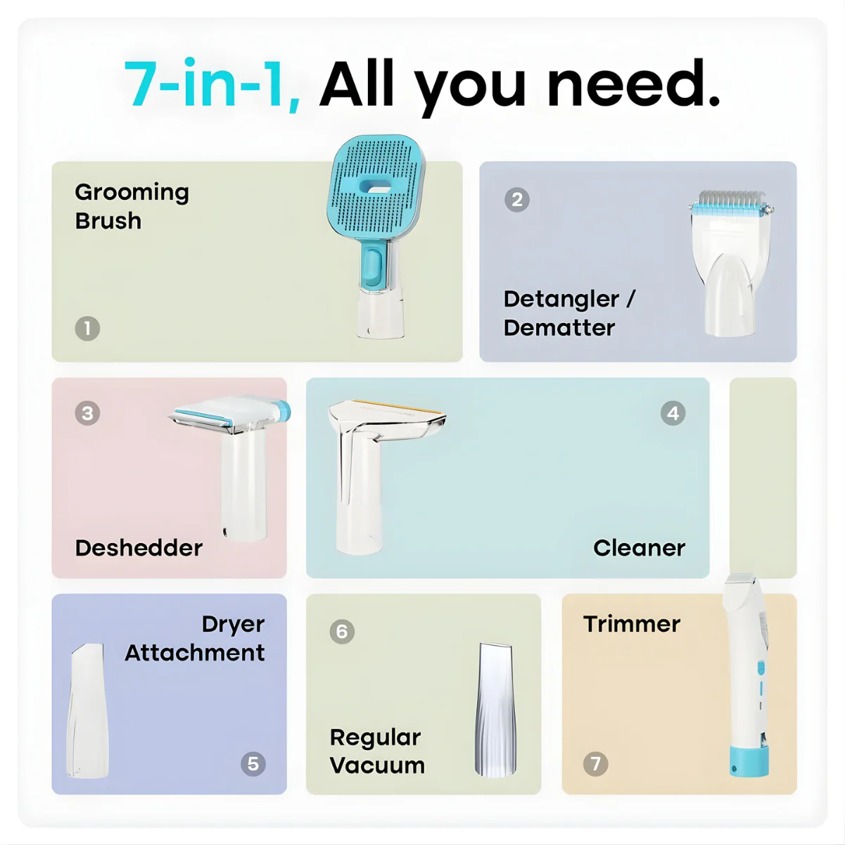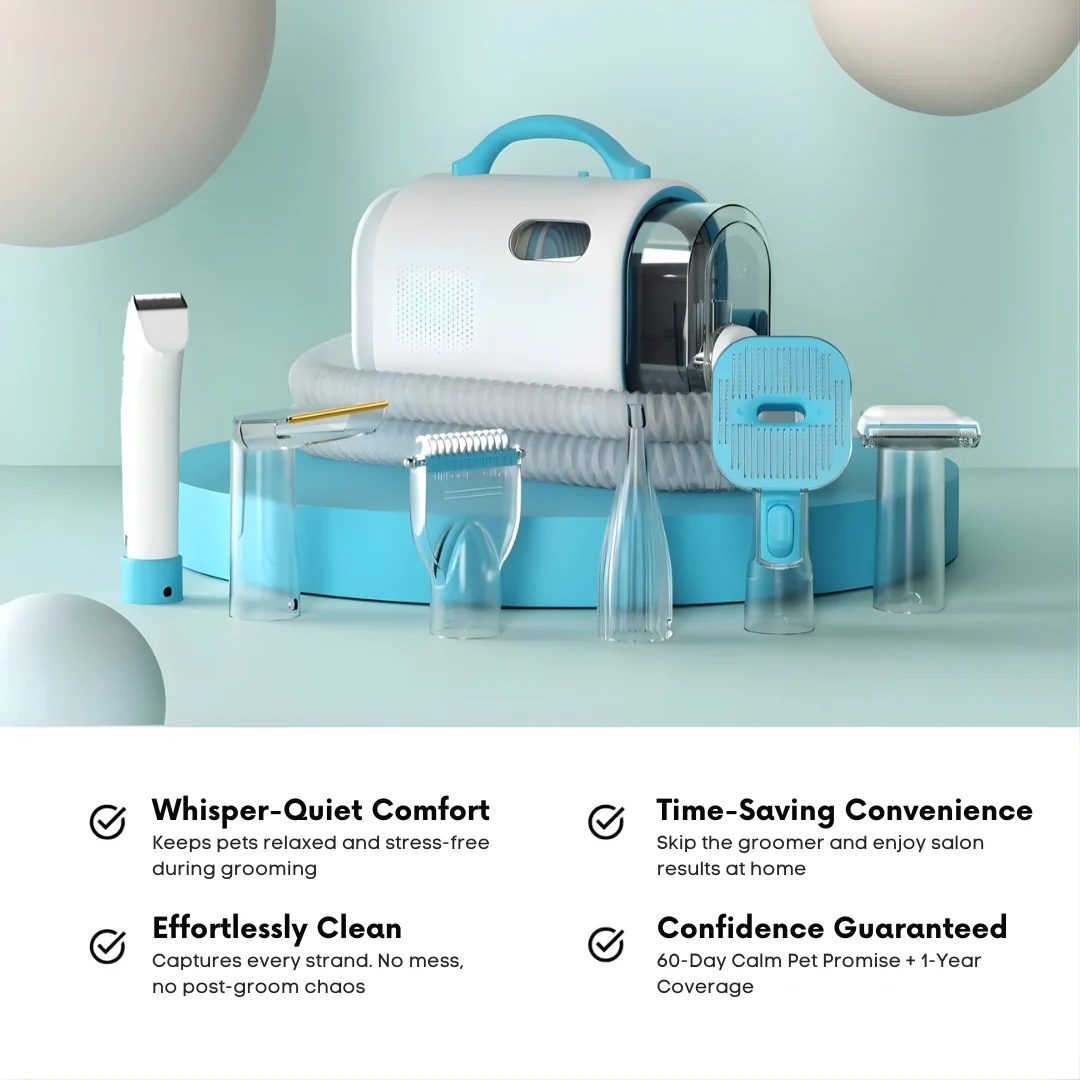 This 7-in-1 marvel redefines pet care, offering seamless brushing, detangling, deshedding, trimming, cleaning, drying, and vacuuming – all without the mess. Engineered for tranquility, its silent operation ensures a calm grooming experience for your beloved pets, leaving them looking their best and your space impeccably clean.